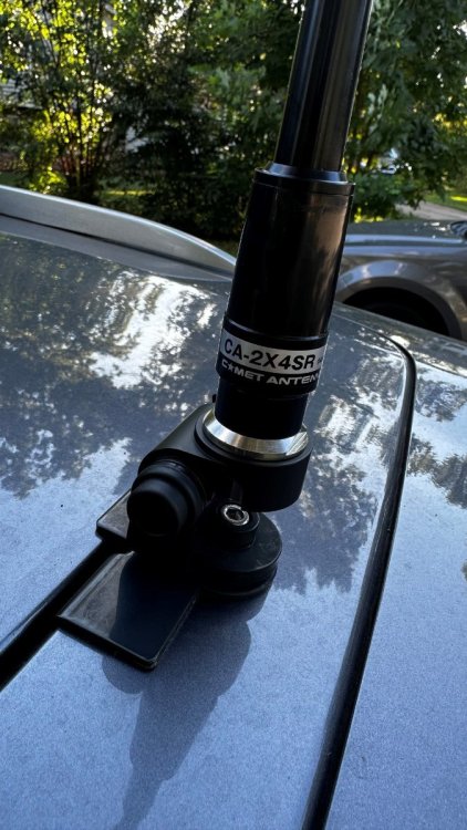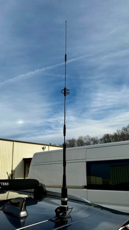 I did go back and add the spring as there are some low hanging branches in our neighborhood, but too the pic before adding the spring. Let me see if I can find one. EDIT - went outside and took a couple with spring. Very stable at highway speeds. EDIT 2 - Yes, I know it's a 2M/70CM antenna, but it does work great on GMRS.3 points