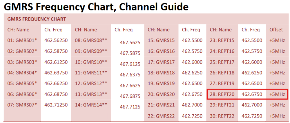 GMRS20 / Ch20 I'm going to bet is a simplex channel. Try RPT20 (if that's what it's called) or probably Channel 28. That'll be your repeater channel. Basically, you're listening to the repeater output but not talking on the repeater input on a simplex channel EDIT: Yep, just looked at the manual. You're looking for Channel 28 on that radio1 point