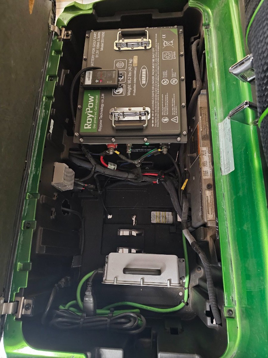 Depends, they are usually special batteries for Golf Car applications. Some are 6 volt single or 12 volt single wet cell non-sealed batteries, (type depends on the model year) that requires refilling the cells with distilled water. The newer gasoline cars are using AGM and Lithium batteries. The Electric Golf Cars are either a 32 volt system, depending on the year model mostly older models, or a 48 volt system for the newer models. The batteries are specific Golf Car 8 volt batteries and are well cells and not sealed. You have to maintain/ service the batteries every 2-4 weeks refilling the cells with distilled water whichnis contingent on the charging cycles. All Golf Cars have some type of an external connection port to connect either an AC cord to charge the battery (ies) using the on-board charging unit or a proprietary external/wall-mount charger.