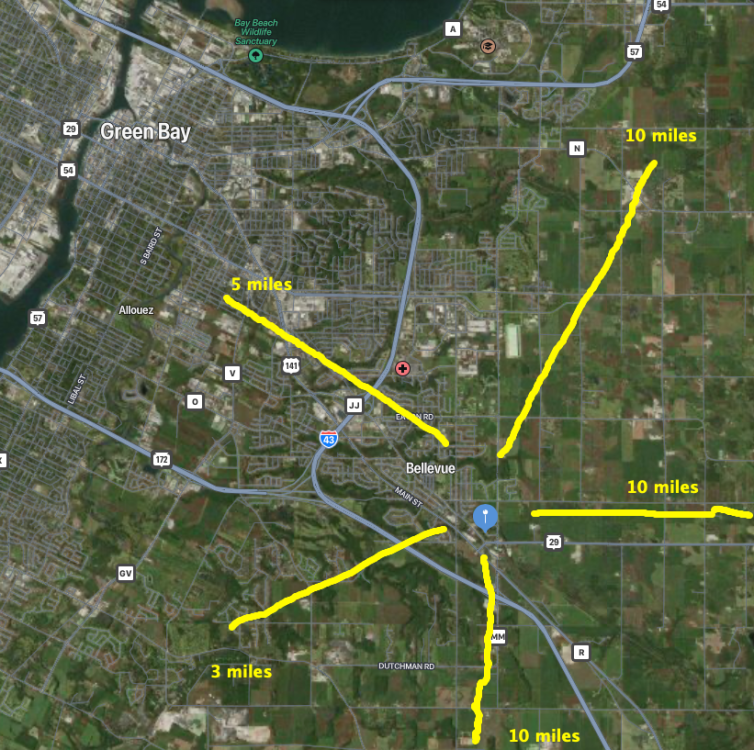 Similar around here as well. Lots of terrain issues. To the west/northwest of me is the city which is down in a valley some 300 feet below me and to my southwest is a 892 foot ridge that kills me. To my northeast, east and southeast is nothing but farmland mainly and that’s where i get my best results. Now if i could only rent a space on that 892 foot hill….. Pardon my crude photo editing skills. Lol.