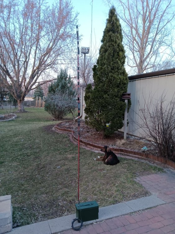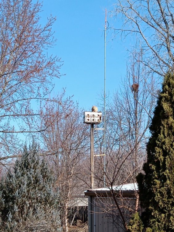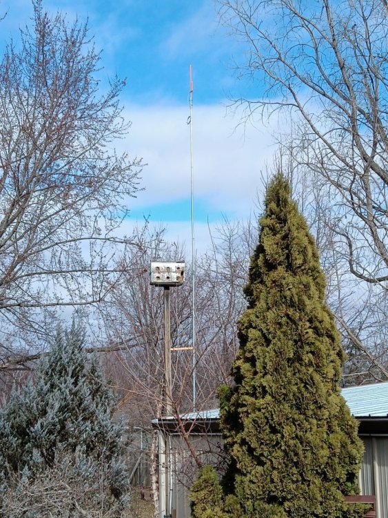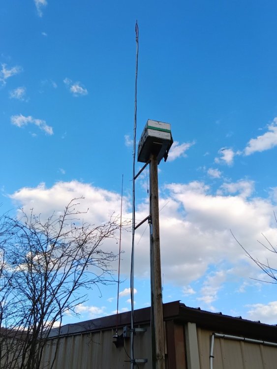 Nice. I went cheap also. Two 3/4” x 10’ chunks of EMT conduit with a coupler from Menards. Two cheap mounting brackets off E-Bay. Bolted the brackets to the garage. Cut a chunk of wood and mounted it to bird house's 4x4 post, then drilled a hole near the end to run some zip ties through attached to the mast. Helps eliminate some swaying. Height of antenna (gmrs tuned j-pole) is roughly 30 feet off the ground. Total cost was less than $50. Whatever works right?