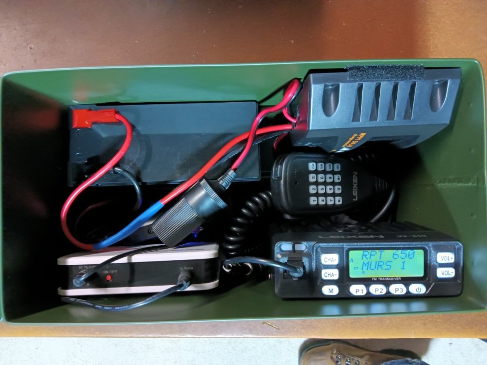 This is a work in progress, but here’s what i have so far. Intended use will be for camping, fishing, power outages, and when SHTF. Ammo can $17 - 6ah lifepo4 battery $19 - 10w eco-worthy solar panel $21 - 30a mppt charge controller $12 - surecom sr-112 simplex repeater controller w/kenwood mobile plug $55 - leixen vv-898 10w uhf/vhf transceiver $67 - velcro $5 - so239 to so239 bulkhead connector $3 - n9tax murs/gmrs tuned slim jim antenna $33 - 2 cig plug sockets $8. Total = $240. I’d still like to change a few things, but it’s functional. Mainly i want to add an external power connector of some sort for solar charging so that i don't have to open it up to get to the other cig plug thats attached to the charge controller. I’m thinking about a marine grade water proof cig plug with dust cover and cutting another hole in the ammo can to mount it, but not sure yet. Also want to add some foam inserts to keep the battery in place. Everything else is either screwed down or held on by velcro. I also want something other than alligator clips on the battery that can be quick connect/disconnect. Inside the box i labeled i have the mic and some other goodies if i want to use it for comms rather than a repeater, or in case of an emergency. The radio is programmed in Bank A with just gmrs repeater freqs, Bank B is programmed with murs/frs/gmrs/marine (for emergency use)/2m calling (for emergency use) and noaa. The leixen only draws .3a idle/RX and 1.5a during TX, so the 6ah (72wh) battery should last for a few days without the solar panel attached if need be. Anyway, here is the functional, but not finished product. (and yes, i have to remove the box to close the lid. the charge controller fits in that spot. might look for a smaller charge controller so that it all fits inside.)