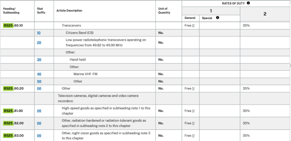 HTS Code 85256011 and import tariffs on radio equipment?