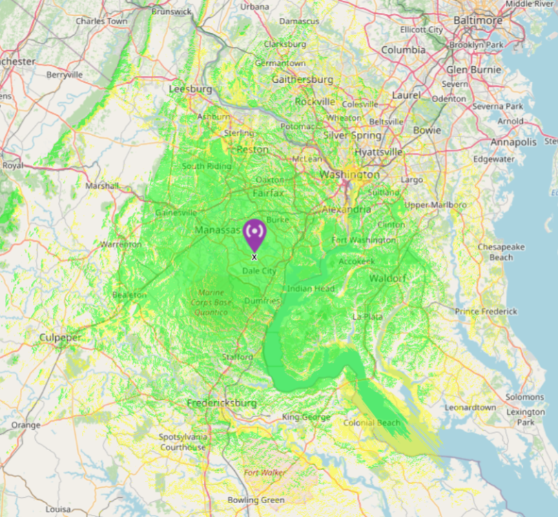 Hey, Peter! Great questions. BTW... if you hear us chatting, you are always welcome to join in! I appreciate the interest. We talked about it a little at our last get-together, but just touched on it. So, I'm happy to give more details. I am a volunteer radio operator with the Amateur Radio Emergency Service (ARES). I serve on a few teams supporting DHS/FEMA, US Marine Corps Quantico (MCCS/MCM), Loudoun County, Prince William County and the Virginia state EOC in Richmond. ARES is a nation-wide group attached to the American Radio Radio League. Our organization has formal MOUs with local, state and federal agencies across the nation. Our team provides a full spectrum of auxiliary (and on occasion, primary) communications support for the aforementioned agencies. That would include, but not limited to, voice traffic, independent email services, wireless LAN/WAN both in an affected area and relayed outside the impact zone, video, GPS and signal tracking, and much, much more. We have had great success in drills and real-world service for more decades than I have been alive, and I am happy to be apart of the organization. These relationships have afforded our teams some special privileges in the radio world. Hospitals, government agencies, and private business all appreciate the services we provide to the community, and to help us provide the best possible services, these agencies/businesses have allowed our groups to install VHF and UHF repeaters on there buildings, commercial radio towers, and on high-elevation properties. We even have repeaters and towers installed in national parks for areas known to frequently need our support. I mention all of this because it is relevant to what is happening with the proposed GMRS repeater. The Prince William County government is allowing us to install a new amateur radio VHF and UHF repeater on a county radio tower. The intent is to have the amateur radio equipment available to all licensed amateurs, while ensuring priority use for ARES supporting the county, state and federal government. Since we are going to have both a VHF and a UHF antenna, we figured we would gang a GMRS repeater on the UHF antenna, having it support both systems. I proposed the use of the GMRS repeater to the county under the same assumptions as the amateur radio repeaters... they will be open to all licensed users, with the county and other served agencies traffic taking priority during drills and emergencies, and the county EC agreed. Keep in mind, we are in the early stages of planning. We need to design the system, acquire hardware, and coordinate frequency use. What we are planning is subject to change... but the proposed details are as fallows. The availability date is currently TBD. As mentioned, we are still gathering parts and the facility is currently in the end stages of renovations. We cannot build until construction is complete. The tower is in the south-eastern part of Prince William County. The base of the tower is about 155 feet above average terrain. The arm the antennas will be on is about 300 feet above ground. We are going to use high-gain folded dipole antennas for all repeaters. We are planning on legal limit for the power output on GMRS (and 100w for the amateur repeaters). The channel is TBD, pending coordination. This will be a publicly accessible repeater, open to all licensed operators. Again, if the repeater is needed for emergency use, we will terminate public access until the emergency need is over. We hope that amateur gear will be sufficient so local families/residents can use the GMRS repeater in a local communications outage. We have not settled on a tone yet, but it will be CTCSS. We will ask local users to use whatever the primary tone we select for day-to-day use, but we will also have 141.3 for emergency/traveler use. The coverage area is theoretical at this point, but below is a projected coverage map showing 99.9% reliability. As we drop down to 70% reliability, the coverage increases dramatically.