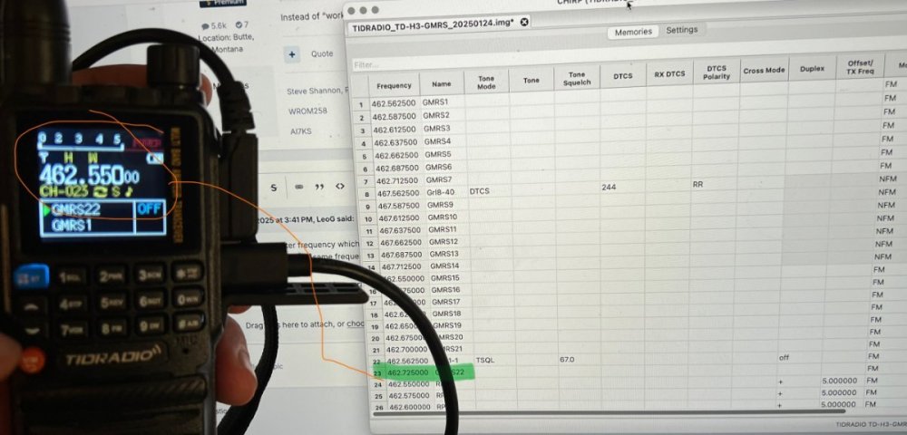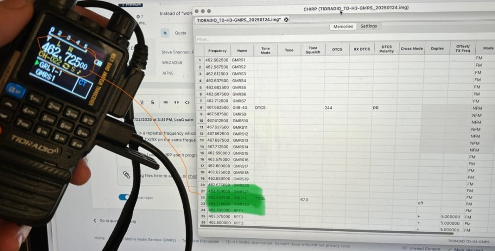Good day! I apologize if this question has been asked/answered -- I did some searching and wasn't able to find anything specific to this, yet I don't believe I'm the first person to encounter this. TLDR; I can't transmit on a second similar frequency channel with or without a "privacy code" I know "privacy code" usage isn't private. I'm using it as a general term for using DCS/CTCSS codes to reduce hearing unwanted signals. Equipment: I have a TIDRADIO TD-H3 (HAM version) running in GMRS mode The firmware version is GMRS_240817 I can and have programmed it on Odmaster or CHIRP I can do some limited work on the HT itself I just got it this week, so I'm still a little new (Jan. 15 2025) Intent: My younger children have some FRS radios where I used FRS/GMRS Channel 1 plus a "privacy code" to (a) reduce some of the distraction from area GMRS/FRS users (b) potentially reduce the possibility that their ears might hear something inappropriate. I'd still like to be able to switch to a regular "privacy code"-free channel when I'm away. I want to talk to communicate with them from my TD-H3. Situation: I can't transmit out on higher of the TD-HD3's two channels if I have a mixture of privacy code and non-privacy code for the same frequency. The radio prevents transmitting on the higher channel of the same simplex frequency. Example: If I use GMRS freq. 1 and put the "privacy code" on HT radio channel 1. I then use a "privacy code" free GMRS freq. 1 on the HT radio's channel/slot 100. I can transmit out and be heard on the FRS radio when I use HT slot 1, but can't actually transmit (and hear a rejection tone) when I use the HT radios slot 100 on the same frequency. If I make HT slot 1 clear of codes and make HT slot 100 the same frequency as channel 1, but use a "privacy code", the radio blocked me from transmitting on slot 100. I discovered this after several hours of troubleshooting and hand-wringing. It didn't matter whether I used DCS or CTCSS. I then tried using "privacy code" on the lower radio channel and put the privacy free* on the greater channel and saw I could use a privacy code successfully. What's a little weird is that I have a repeater setup with a CT tone and the radio will transmit fine. I don't know if this is by design or a limitation of the TD-H3 and similar firmware. For all I know, it might be a general phenomenon of TIDRADIO products. Comparison: I have a brand new pair of Baofeng 5RMs that I would like to see if they exhibit the same phenomenon, but there are issues with the programming over the cable preventing me from quickly programming them. Maybe I'll figure out how to program them on the keypad. Observation: I get the feeling that Baofeng and TIDRADIO are basically the same manufacturer but simply different brands. Kind regards, Jim Woodleaf, NC USA WSGP797