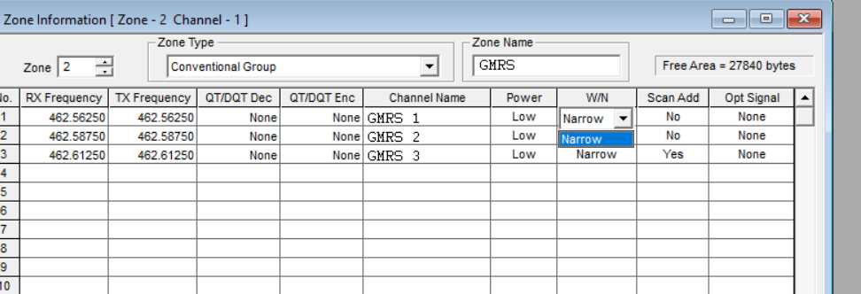 I just purchased a Kenwood TK8180 the 450-520 K model and its being shipped. In the meantime, I downloaded and paid for software. I'm currently programming and noticed an issue. It will not let me select "wide" under the option for wide or narrow when I am programming GMRS channels it only has the narrow option however, when I was programming some local public safety frequencies in it does give me the option for wide or narrow band. What am I doing wrong?