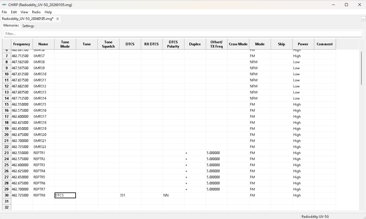 My radio: Baofeng UV-5G (but lists as RadioOddity in CHIRP)