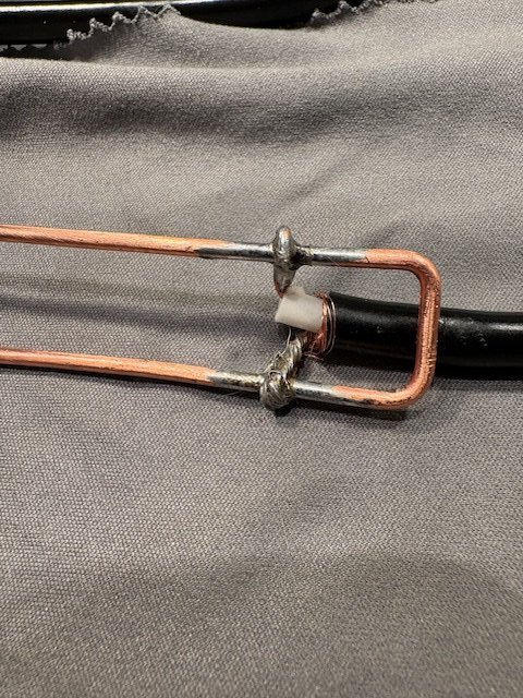 Ok, so I decided to start over. OooooPs. This time trimmed too much and ended up around 1:2 . I promised a pic. It doesn't look like much, but here it is: Have electrical tape on the bottom to keep the coax from moving around and electrical tape holding the plexiglass stand-off while the glue dries. Probably will just leave it on. On a brighter note have the soldering problem solved. Got a monster Weller D650 with 300 Watts of heating power. Solder is flowing like water. Beautiful soldering job. Might try a 3rd build just to see if I can do better but this one is solid. -