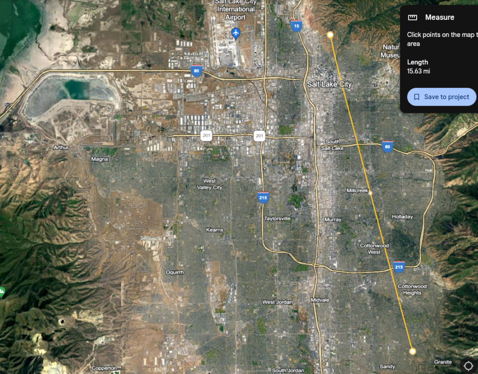 By way of an update, I just repeated the test from a slightly different location, 200ft lower, 1 mile west. But this time I used a Baofeng UV-5G connected to a magnetic mount, attached to a window air conditioner, and using a Comet CA2X4SRNMO antenna. This radio puts out 3.5w to 4w depending on its mood. My SWR with this antenna in its current mounting configuration is around 1.1:1, so very good. I tested against the Ogden repeater, which is about 43.3 miles from this location. This time I didn't get through, or at least didn't get a response. I might try again later, because ..... Then I tried against the Promontory repeater, which is 63.7 miles from my current location. With a handheld Baofeng UV-5G and a Comet CA2X4SR antenna, I got a signal report back that claimed "Clear, very little static, audio just a little low, but sounds good." I never really expected to reach the Promontory repeater at over 63 miles with a handheld, regardless of whether I had a good antenna connected to it, but to my surprise I got through fairly well. Failing to hit the Ogden repeater may be because my elevation is a couple hundred feet lower, and and the Ensign Peak area could be interfering from this elevation. Or it could be that I have more tree interference from this location. Anyway, one more proof that you don't necessarily need a lot of wattage to reach out over a great distance. You need a good antenna and pretty good line of sight. 63.7 miles at 3.5-4w with an external antenna mounted on a window air conditioner. It shouldn't be surprising that I was also able to hit the Ensign Peak Capitol repeater, at 15.6 miles: