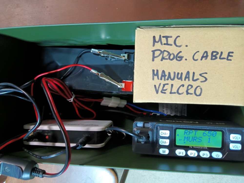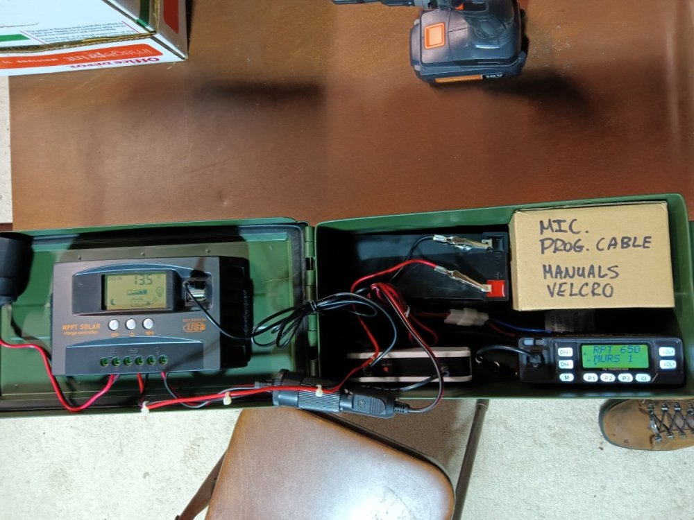 This is a work in progress, but here’s what i have so far. Intended use will be for camping, fishing, power outages, and when SHTF. Ammo can $17 - 6ah lifepo4 battery $19 - 10w eco-worthy solar panel $21 - 30a mppt charge controller $12 - surecom sr-112 simplex repeater controller w/kenwood mobile plug $55 - leixen vv-898 10w uhf/vhf transceiver $67 - velcro $5 - so239 to so239 bulkhead connector $3 - n9tax murs/gmrs tuned slim jim antenna $33 - 2 cig plug sockets $8. Total = $240. I’d still like to change a few things, but it’s functional. Mainly i want to add an external power connector of some sort for solar charging so that i don't have to open it up to get to the other cig plug thats attached to the charge controller. I’m thinking about a marine grade water proof cig plug with dust cover and cutting another hole in the ammo can to mount it, but not sure yet. Also want to add some foam inserts to keep the battery in place. Everything else is either screwed down or held on by velcro. I also want something other than alligator clips on the battery that can be quick connect/disconnect. Inside the box i labeled i have the mic and some other goodies if i want to use it for comms rather than a repeater, or in case of an emergency. The radio is programmed in Bank A with just gmrs repeater freqs, Bank B is programmed with murs/frs/gmrs/marine (for emergency use)/2m calling (for emergency use) and noaa. The leixen only draws .3a idle/RX and 1.5a during TX, so the 6ah (72wh) battery should last for a few days without the solar panel attached if need be. Anyway, here is the functional, but not finished product. (and yes, i have to remove the box to close the lid. the charge controller fits in that spot. might look for a smaller charge controller so that it all fits inside.)