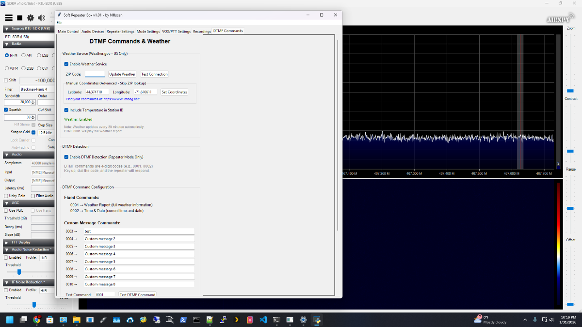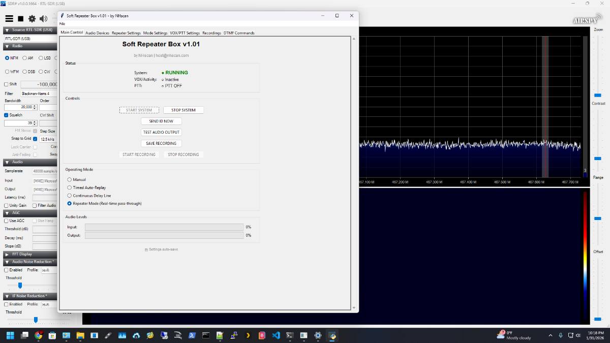 Transform your computer into a full-featured amateur radio repeater controller with DTMF commands, weather integration, and professional PTT control! Core Functionality 4 Operating Modes: Manual, Timed Auto-Replay, Continuous Delay Line, Full Repeater VOX Detection: Software voice-activated transmission PTT Control: USB relay support (DTR/RTS) for hardware PTT Recording: Save transmissions as WAV files Courtesy Tones: Configurable beep after transmissions Repeater Features Automatic Station ID: Configurable callsign with time/date/weather Timeout Timer: Prevent excessive key-ups Tail Silence: Hang time after transmission TTS Integration: Text-to-speech for announcements Feedback Protection: Prevent audio loops Advanced Features DTMF Commands: 10 configurable remote commands (0001-0010) Weather Integration: Live weather via Weather.gov API Audio Controls: Real-time input/output gain adjustment Debug Mode: Toggle verbose console output Auto-Save Config: All settings persist between sessions https://github.com/Nhscan/Soft_Repeater_Box