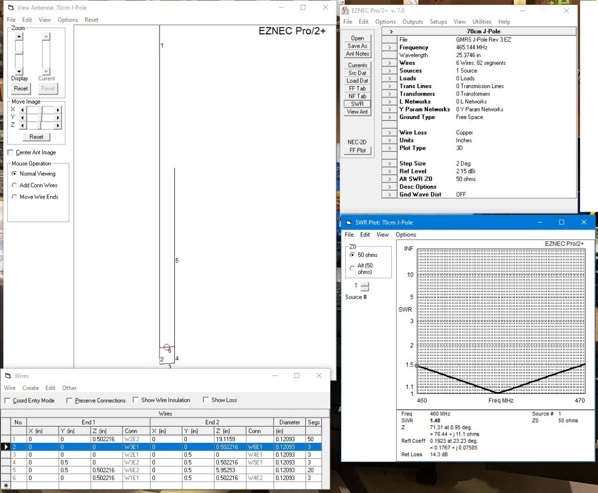 Used a drill and a vice to straighten the wire. Ran into one problem, I don't have a hot enough soldering iron/gun for that large copper. Have one on order but I did manage to get a solid solder connection although not pretty. Left both legs of the antenna long and trimmed each by 1/8" increments. Hit 1:1.03 at one point and should have left it alone. It is now at 1:1.2 which is fine for my first build. Used micrometers to measure spacing and feed points. Still have a little work to do on it. Want to re-melt the solder joints when the hotter gun get's here. Want to make some "standoffs" out of plexiglass for between the elements for consistency. Will pick up a chunk of PVC to wrap it in. Used RGB 8X for pigtail which is fine with me as it is only 6" long with less than 1% loss. Transceiver is putting out 9.9 out of 10 watts.